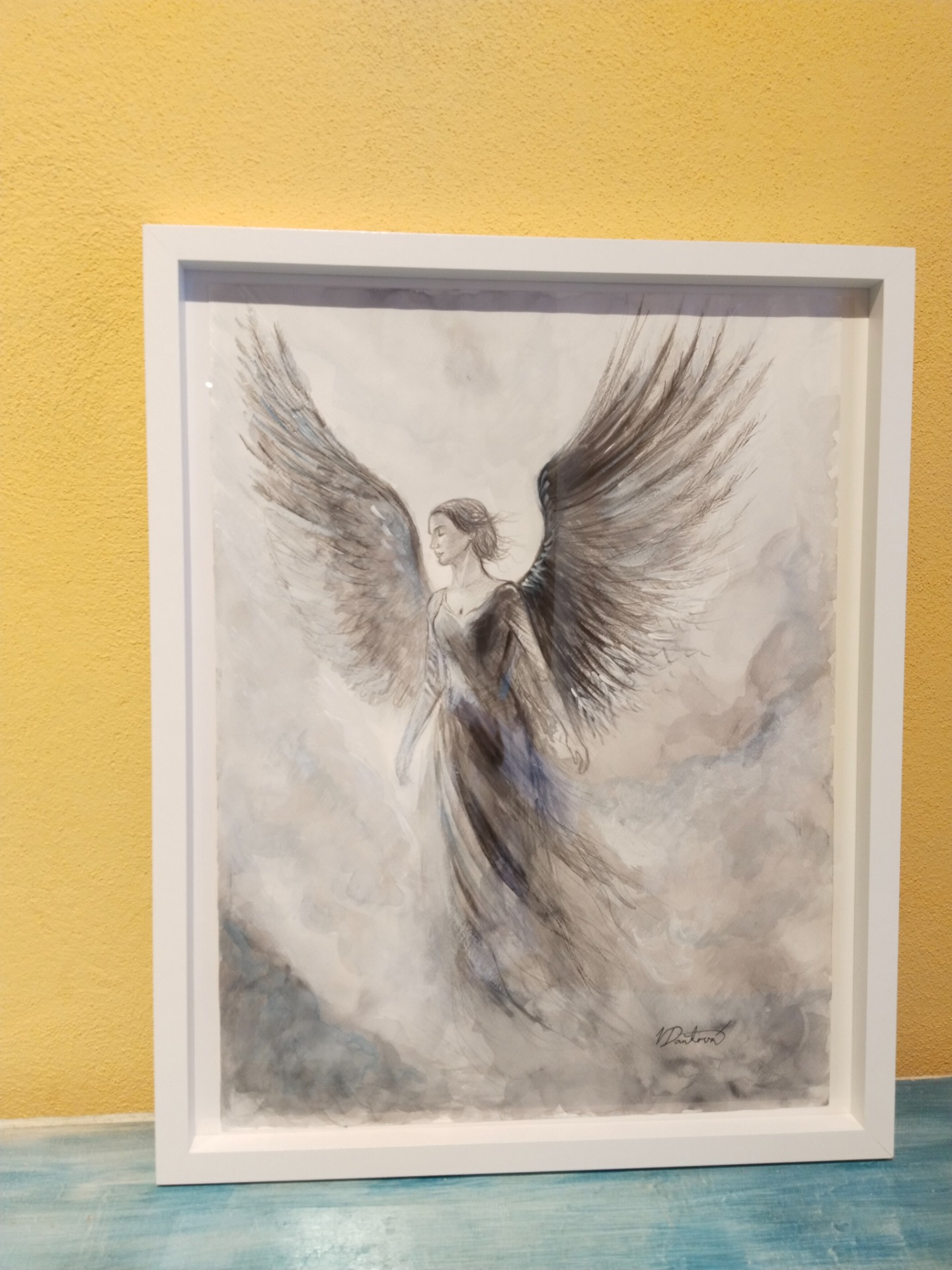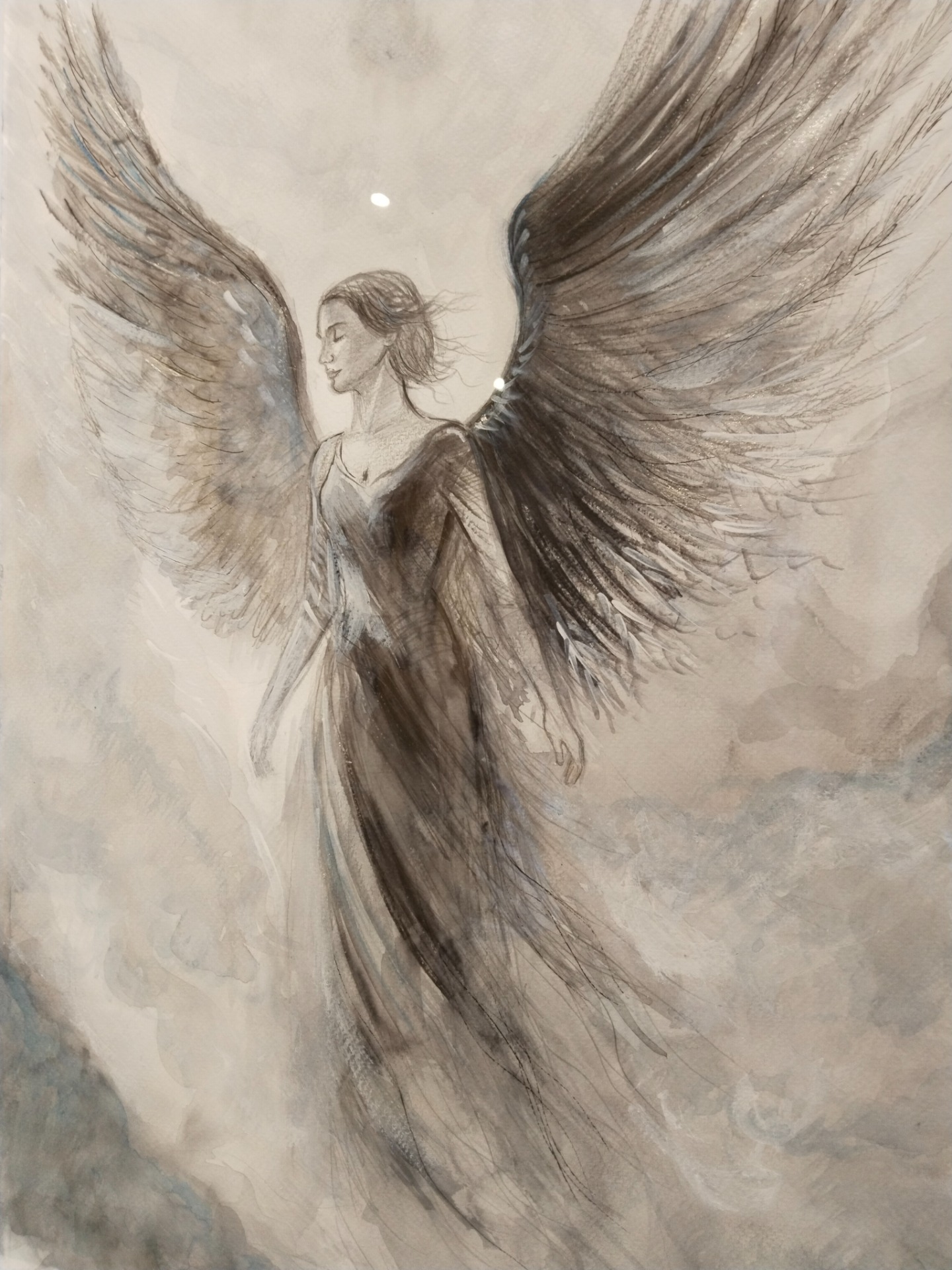 ANDĚL/mezi koncem a začátkem. Cíl je jen bod, ale to nejdůležitější se děje právě mezi začátkem a koncem. Technika akvarel, malba 36x48 cm+rám. Cena včetně dopravy a baleného.